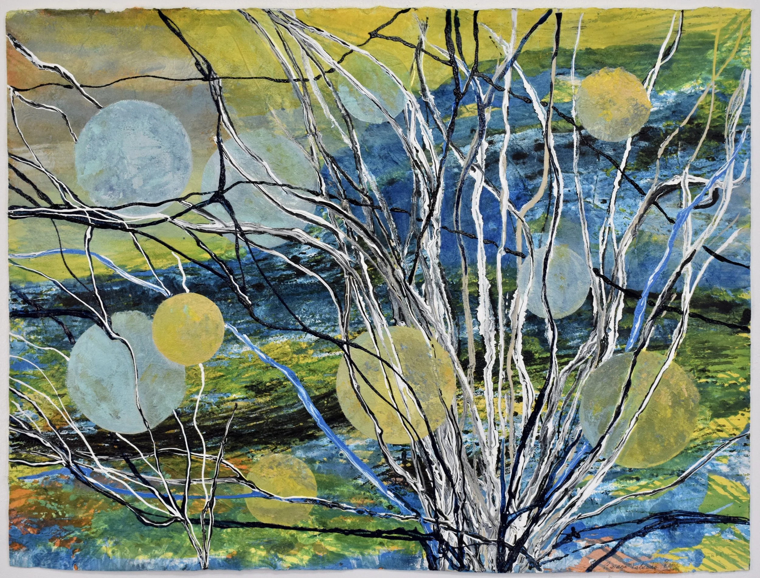 The rough path not take, 2023, Oil paint, Acrylic, ink pens, yarn, collage on paper, 30 x 22 in